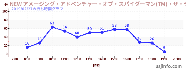 • NEW アメージング・アドベンチャー・オブ・スパイダーマン(TM)・ザ・ライド 4K3D$B$N(B2019年02月27日の待ち時間