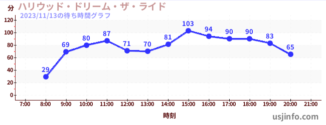 • ハリウッド・ドリーム・ザ・ライド〜バックドロップ〜$B$N(B2023年11月13日の待ち時間