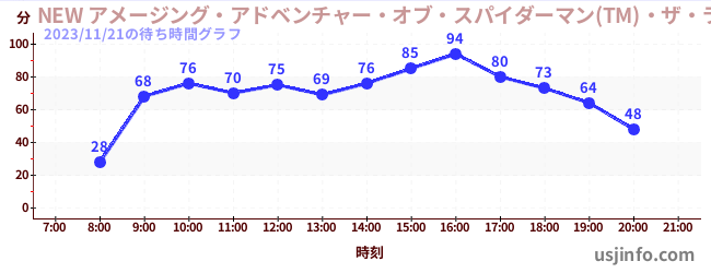 • NEW アメージング・アドベンチャー・オブ・スパイダーマン(TM)・ザ・ライド 4K3D$B$N(B2023年11月21日の待ち時間