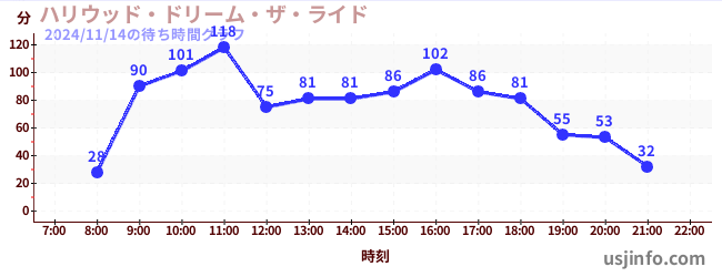 • ハリウッド・ドリーム・ザ・ライド〜バックドロップ〜$B$N(B2024年11月14日の待ち時間