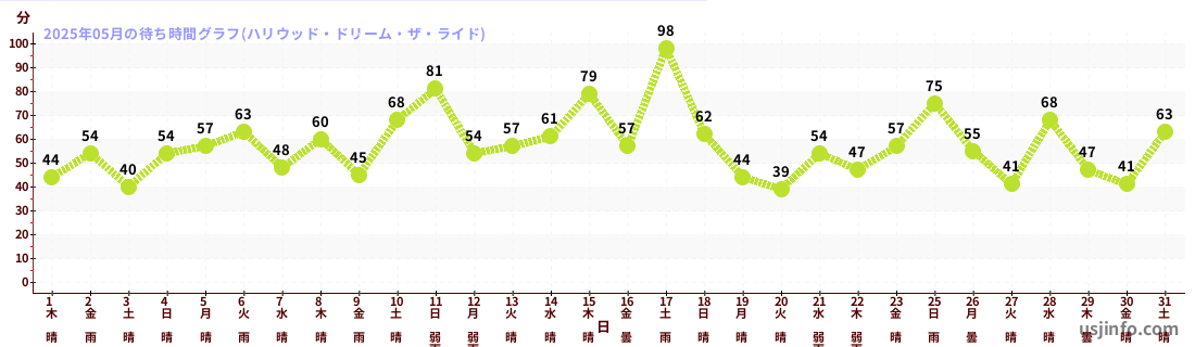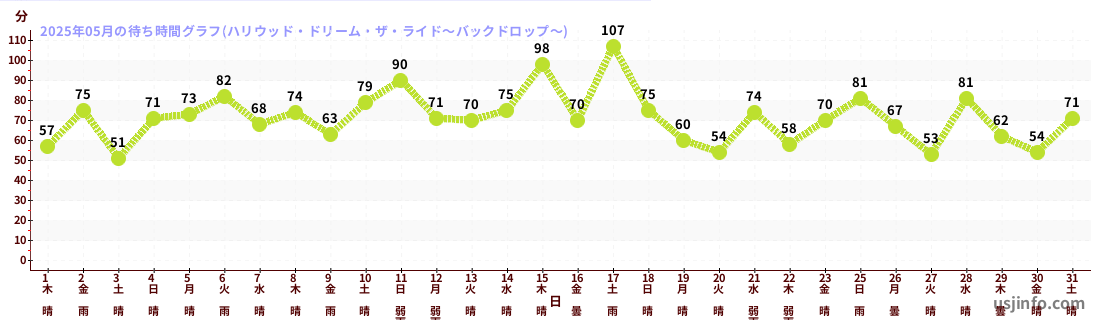 • ハリウッド・ドリーム・ザ・ライド$B$N(B2025年05月01日のの一日平均待ち時間