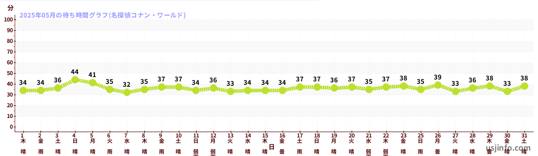 • 名探偵コナン・ワールド$B$N(B2025年05月01日のの一日平均待ち時間