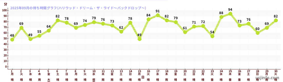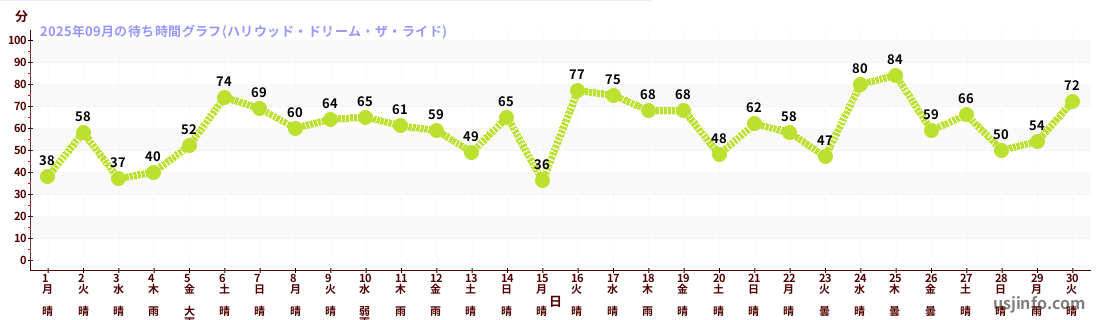 • ハリウッド・ドリーム・ザ・ライド$B$N(B2025年09月01日のの一日平均待ち時間