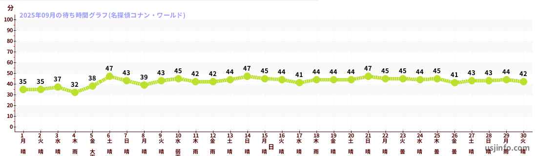 • 名探偵コナン・ワールド$B$N(B2025年09月01日のの一日平均待ち時間