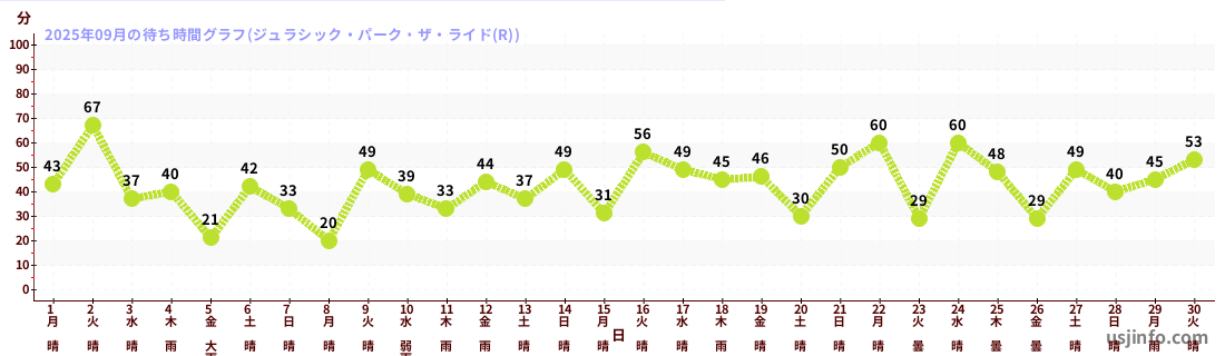 • ジュラシック・パーク・ザ・ライド(R)$B$N(B2025年09月01日のの一日平均待ち時間