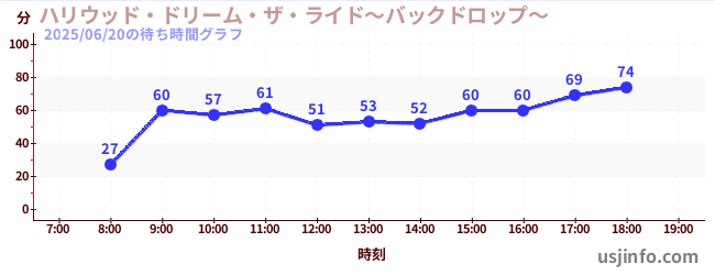 • ハリウッド・ドリーム・ザ・ライド〜バックドロップ〜$B$N(B2025年06月20日の待ち時間