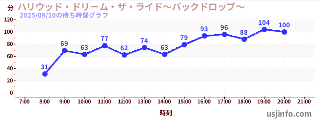 • ハリウッド・ドリーム・ザ・ライド〜バックドロップ〜$B$N(B2025年09月10日の待ち時間