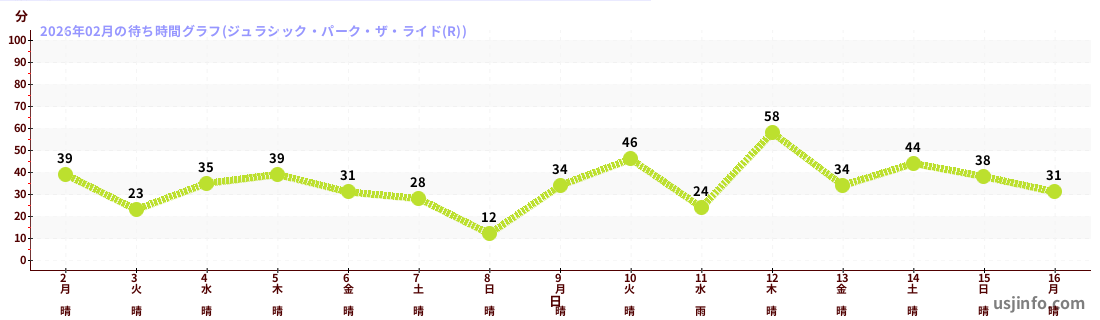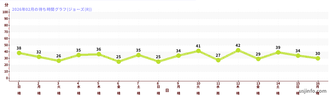 • ジョーズ(R)$B$N(B2026年02月01日のの一日平均待ち時間