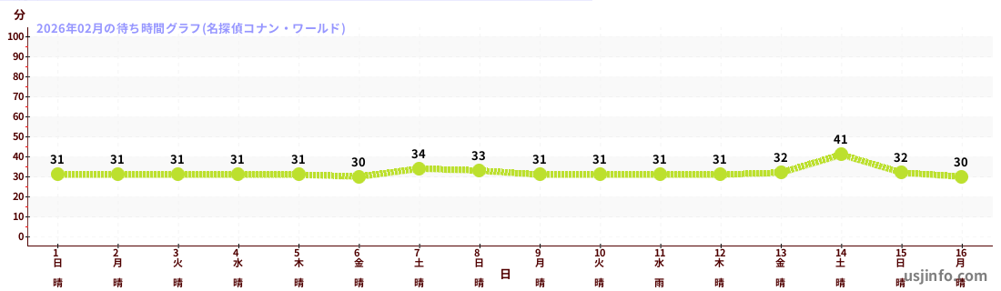 • 名探偵コナン・ワールド$B$N(B2026年02月01日のの一日平均待ち時間