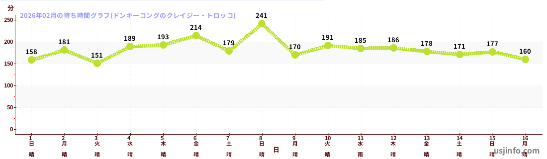 • ドンキーコングのクレイジー・トロッコ$B$N(B2026年02月01日のの一日平均待ち時間