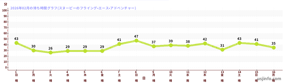 • スヌーピーのフライング•エース•アドベンチャー$B$N(B2026年02月01日のの一日平均待ち時間
