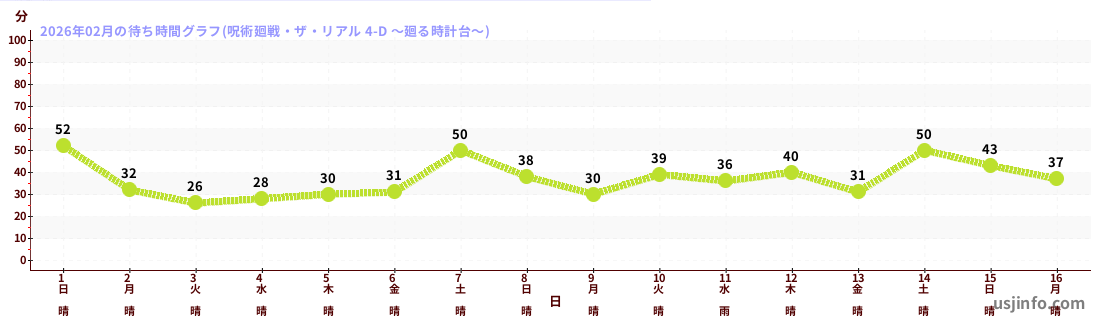 • 呪術廻戦・ザ・リアル 4-D ~廻る時計台~$B$N(B2026年02月01日のの一日平均待ち時間