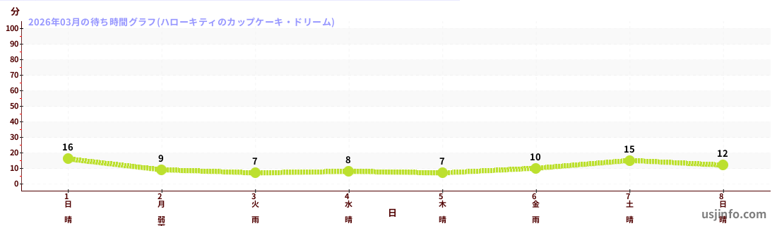 • ハローキティのカップケーキ・ドリーム$B$N(B2026年03月01日のの一日平均待ち時間