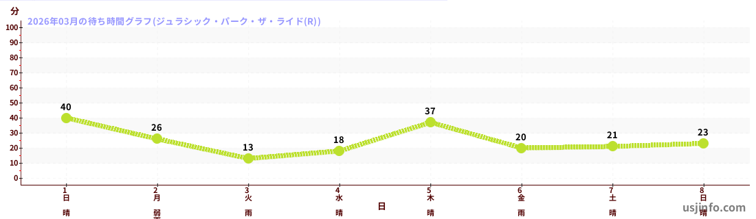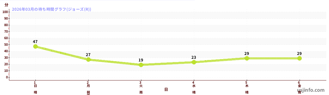 • ジョーズ(R)$B$N(B2026年03月01日のの一日平均待ち時間