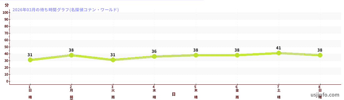 • 名探偵コナン・ワールド$B$N(B2026年03月01日のの一日平均待ち時間