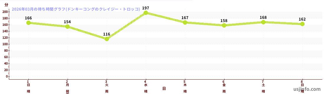 • ドンキーコングのクレイジー・トロッコ$B$N(B2026年03月01日のの一日平均待ち時間