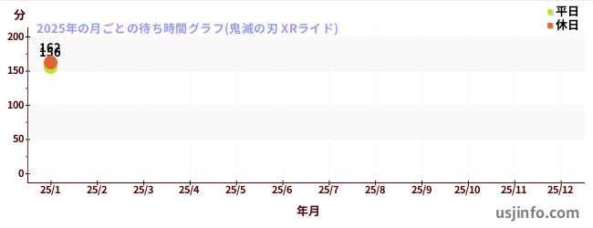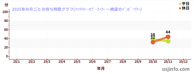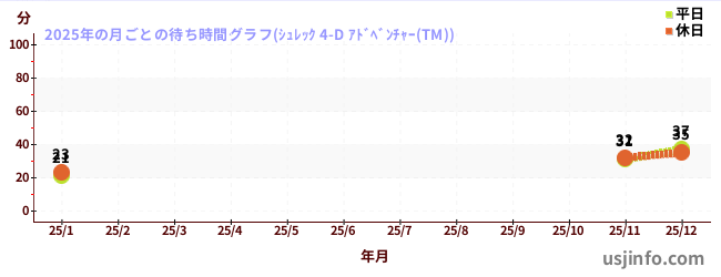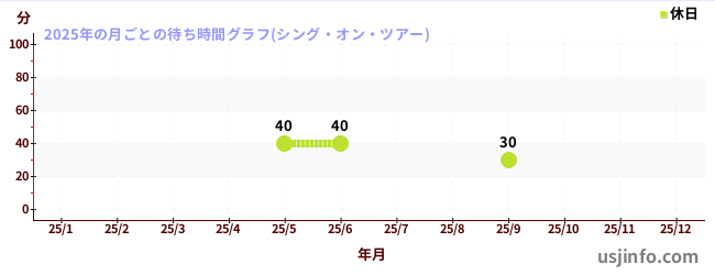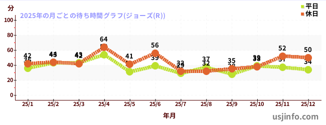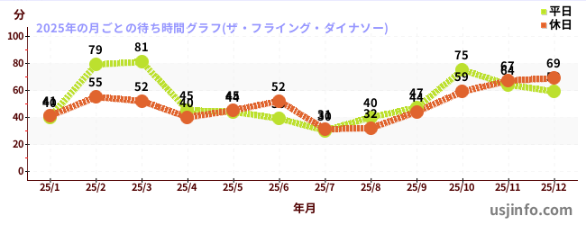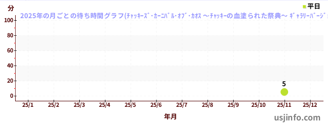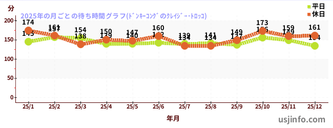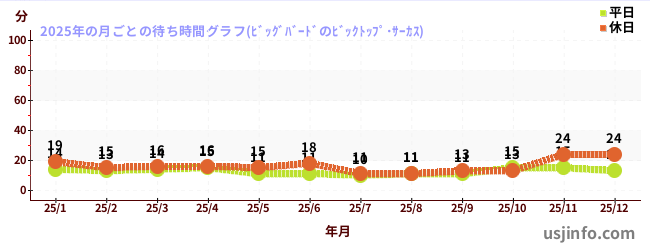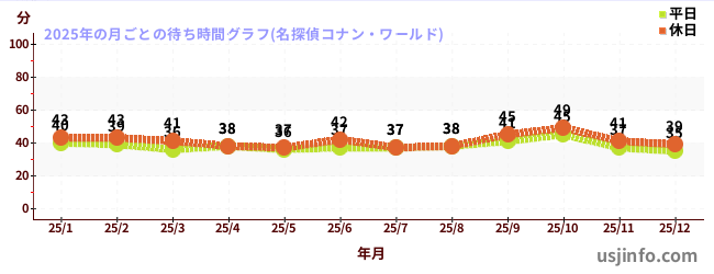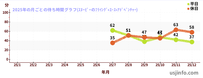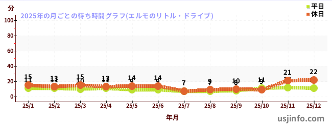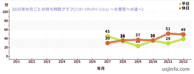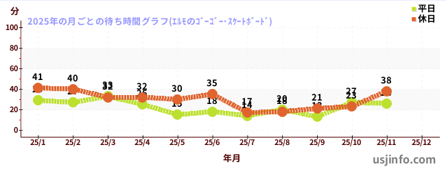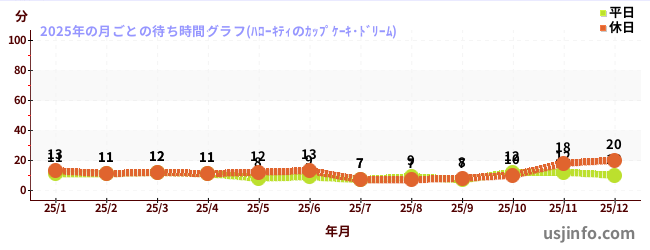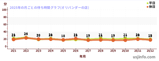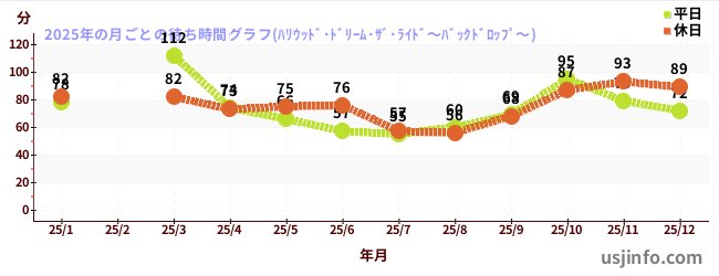 2025年の各月の月平均待ち時間(晴れ曇りの日限定)