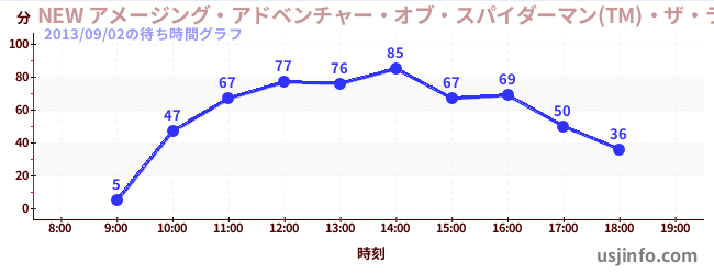 • NEW アメージング・アドベンチャー・オブ・スパイダーマン(TM)・ザ・ライド 4K3D$B$N(B2013年09月02日の待ち時間