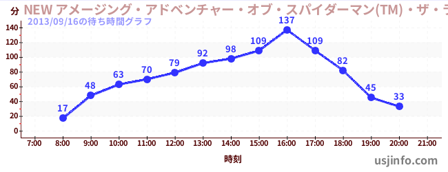 • NEW アメージング・アドベンチャー・オブ・スパイダーマン(TM)・ザ・ライド 4K3D$B$N(B2013年09月16日の待ち時間