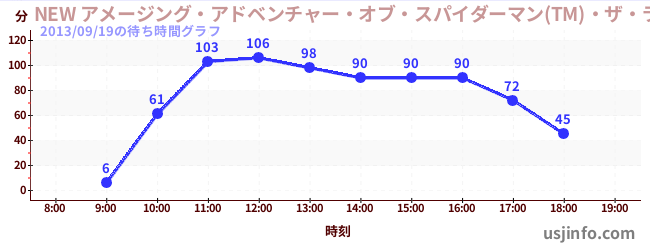 • NEW アメージング・アドベンチャー・オブ・スパイダーマン(TM)・ザ・ライド 4K3D$B$N(B2013年09月19日の待ち時間