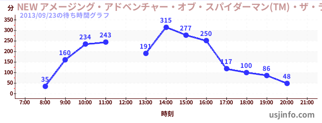 • NEW アメージング・アドベンチャー・オブ・スパイダーマン(TM)・ザ・ライド 4K3D$B$N(B2013年09月23日の待ち時間
