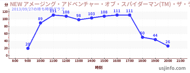 • NEW アメージング・アドベンチャー・オブ・スパイダーマン(TM)・ザ・ライド 4K3D$B$N(B2013年09月27日の待ち時間