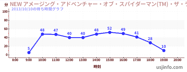 • NEW アメージング・アドベンチャー・オブ・スパイダーマン(TM)・ザ・ライド 4K3D$B$N(B2013年10月10日の待ち時間