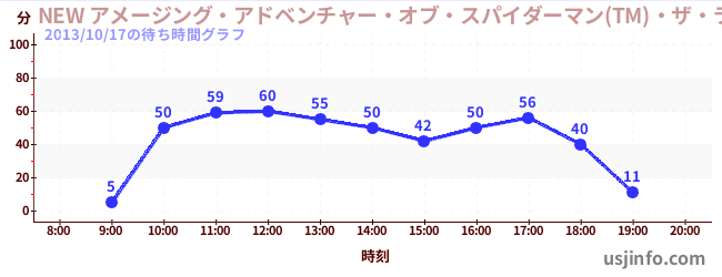 • NEW アメージング・アドベンチャー・オブ・スパイダーマン(TM)・ザ・ライド 4K3D$B$N(B2013年10月17日の待ち時間