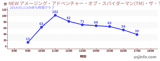 • NEW アメージング・アドベンチャー・オブ・スパイダーマン(TM)・ザ・ライド 4K3D$B$N(B2014年01月13日の待ち時間