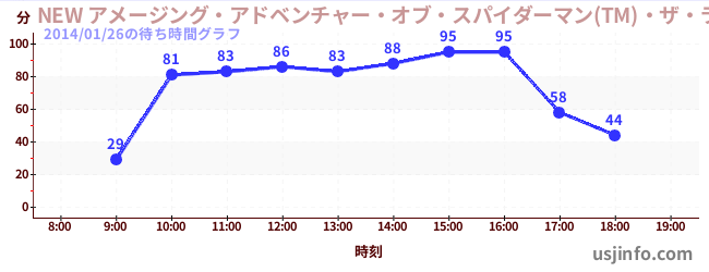 • NEW アメージング・アドベンチャー・オブ・スパイダーマン(TM)・ザ・ライド 4K3D$B$N(B2014年01月26日の待ち時間