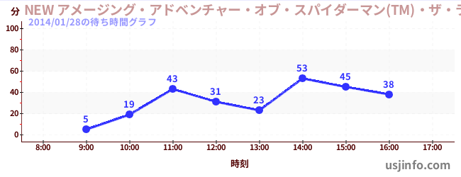 • NEW アメージング・アドベンチャー・オブ・スパイダーマン(TM)・ザ・ライド 4K3D$B$N(B2014年01月28日の待ち時間