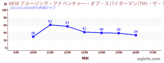 • NEW アメージング・アドベンチャー・オブ・スパイダーマン(TM)・ザ・ライド 4K3D$B$N(B2014年01月30日の待ち時間