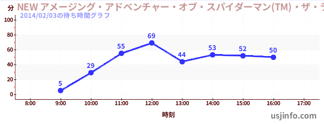 • NEW アメージング・アドベンチャー・オブ・スパイダーマン(TM)・ザ・ライド 4K3D$B$N(B2014年02月03日の待ち時間
