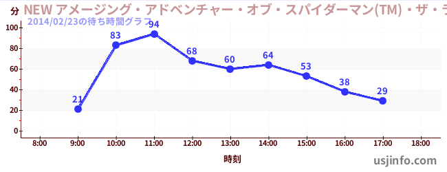 • NEW アメージング・アドベンチャー・オブ・スパイダーマン(TM)・ザ・ライド 4K3D$B$N(B2014年02月23日の待ち時間