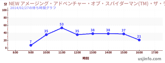 • NEW アメージング・アドベンチャー・オブ・スパイダーマン(TM)・ザ・ライド 4K3D$B$N(B2014年02月27日の待ち時間