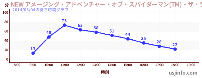 • NEW アメージング・アドベンチャー・オブ・スパイダーマン(TM)・ザ・ライド 4K3D$B$N(B2014年03月04日の待ち時間