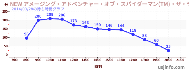 • NEW アメージング・アドベンチャー・オブ・スパイダーマン(TM)・ザ・ライド 4K3D$B$N(B2014年03月28日の待ち時間