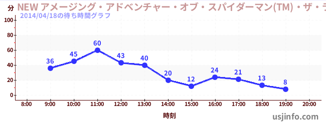 • NEW アメージング・アドベンチャー・オブ・スパイダーマン(TM)・ザ・ライド 4K3D$B$N(B2014年04月18日の待ち時間