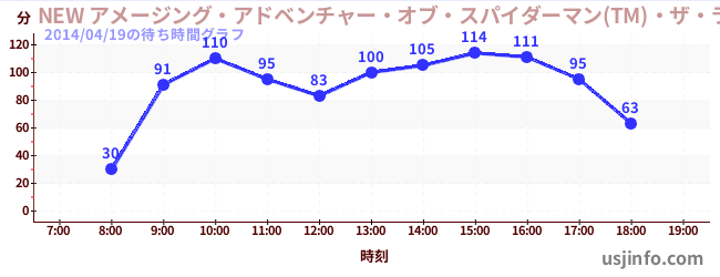• NEW アメージング・アドベンチャー・オブ・スパイダーマン(TM)・ザ・ライド 4K3D$B$N(B2014年04月19日の待ち時間