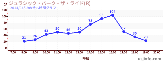 • ジュラシック・パーク・ザ・ライド(R)$B$N(B2014年04月19日の待ち時間
