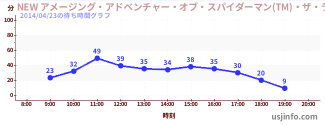 • NEW アメージング・アドベンチャー・オブ・スパイダーマン(TM)・ザ・ライド 4K3D$B$N(B2014年04月23日の待ち時間