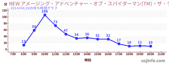 • NEW アメージング・アドベンチャー・オブ・スパイダーマン(TM)・ザ・ライド 4K3D$B$N(B2014年04月26日の待ち時間