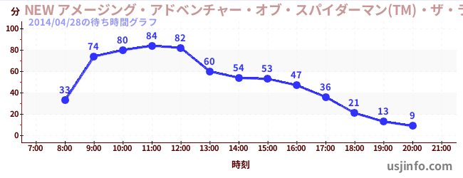 • NEW アメージング・アドベンチャー・オブ・スパイダーマン(TM)・ザ・ライド 4K3D$B$N(B2014年04月28日の待ち時間