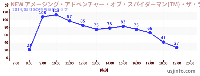• NEW アメージング・アドベンチャー・オブ・スパイダーマン(TM)・ザ・ライド 4K3D$B$N(B2014年05月10日の待ち時間