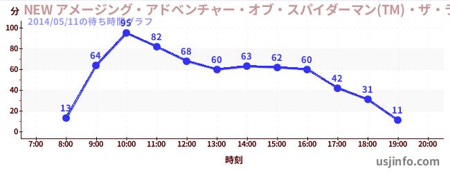 • NEW アメージング・アドベンチャー・オブ・スパイダーマン(TM)・ザ・ライド 4K3D$B$N(B2014年05月11日の待ち時間