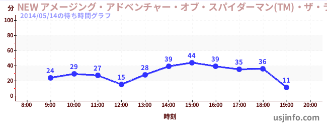 • NEW アメージング・アドベンチャー・オブ・スパイダーマン(TM)・ザ・ライド 4K3D$B$N(B2014年05月14日の待ち時間