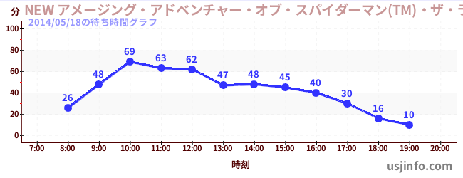 • NEW アメージング・アドベンチャー・オブ・スパイダーマン(TM)・ザ・ライド 4K3D$B$N(B2014年05月18日の待ち時間
