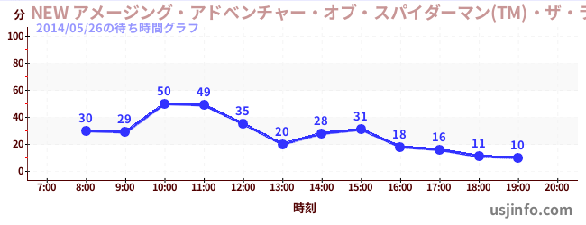 • NEW アメージング・アドベンチャー・オブ・スパイダーマン(TM)・ザ・ライド 4K3D$B$N(B2014年05月26日の待ち時間