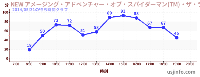 • NEW アメージング・アドベンチャー・オブ・スパイダーマン(TM)・ザ・ライド 4K3D$B$N(B2014年05月31日の待ち時間