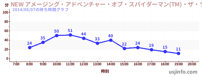 • NEW アメージング・アドベンチャー・オブ・スパイダーマン(TM)・ザ・ライド 4K3D$B$N(B2014年06月07日の待ち時間